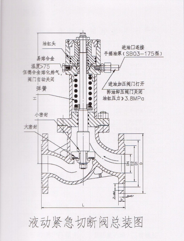 不銹鋼液動(dòng)緊急切斷閥通過(guò)手搖油泵手柄做往復動(dòng)作,使壓力增高來(lái)打開(kāi)緊急切斷閥,介質(zhì)即可通過(guò),如遇火災或其他緊急情況時(shí),將手搖油泵的卸壓閥打開(kāi),油壓系統迅速泄壓,使緊急切斷閥立即關(guān)閉,或溫度升高至75℃以上時(shí),安裝在油泵或緊急切斷閥的易熔塞立即熔化,達到自動(dòng)泄壓目的,使緊急切斷閥自動(dòng)迅速關(guān)閉。
