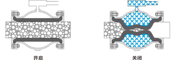 進(jìn)入管套與閥體之間的空腔時(shí),橡膠管套在介質(zhì)壓力下變形截流。
